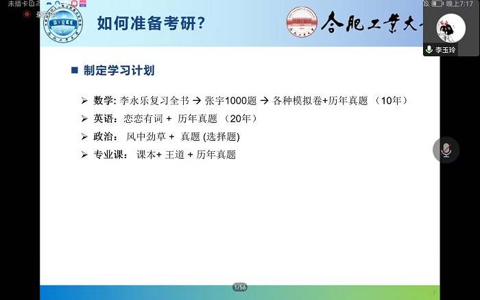 会议开始时,先发言的是毕业后选择考研的学姐。学姐先是肯定了考研的意义,分析了目前考研人数越来越多的现状,提醒同学们根据自己自身的情况来选择是否考研,不要盲目跟风考研。之后学姐向未来向选择考研的同学分享了自己的备考经验,教育同学们要目标明确,充分利用时间,在有限的时间内达到最好的学习效果。