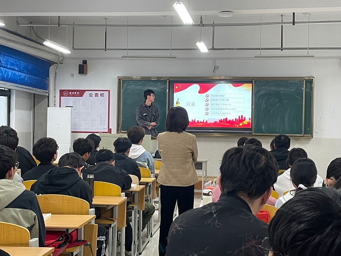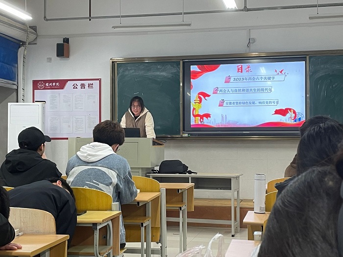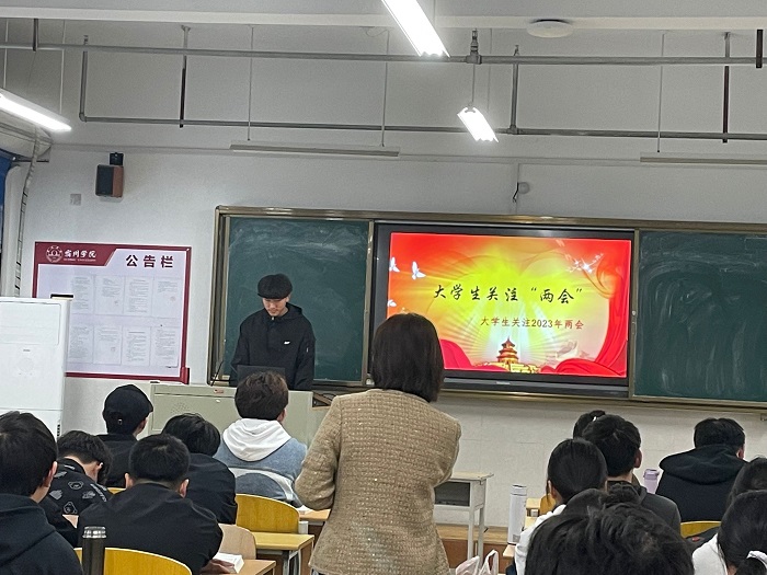 此次活动以自由分组演讲的形式展开,融合课本上的知识谈谈自己在各方面对两会的看法。主持人简单介绍了先是简单介绍了两会的概况,之后再此基础上引申出我们作为大学生为什么知道两会,以此教育同学们要学习其宝贵的精神。之后各组演讲人按顺序依次上台演讲自己对于两会某方面的痛点问题,台上的演讲人与背景板互相呼应,说出了中国新青年对祖国建设的骄傲与肯定。台下等待的同学不停响起的掌声,是对台上同学的赞许,更是对中国如今飞速发展骄傲地共鸣。