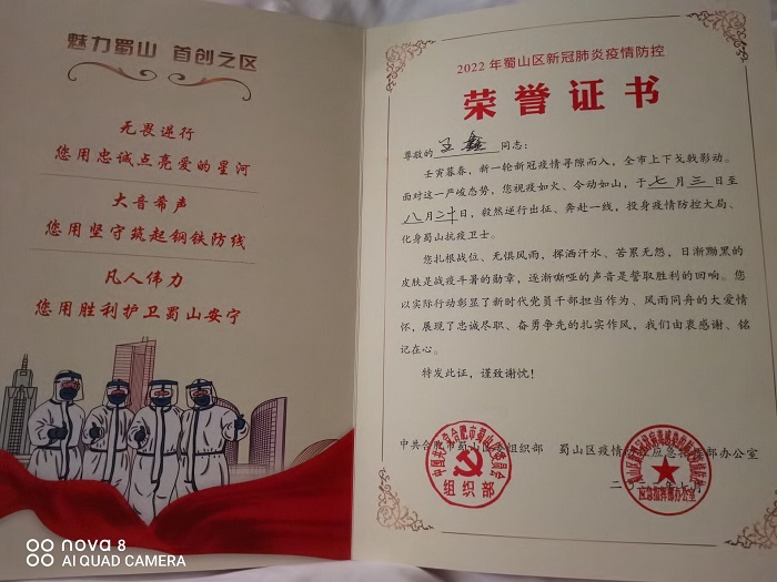 我班王鑫同学在家乡蜀山高速路口参与疫情防控的站岗工作。工作期间,王鑫同学换上蓝色的工作服,佩戴口罩,认真站在防疫站口,仔细检查过往车辆的安全码和行程码,提醒来往车辆行驶注意事项。工作过程严肃负责,过往车辆井然有序。工作结束后,王鑫同学的付出得到了社区的肯定,社区为王鑫同学颁发了疫情防控工作的荣誉证书。王鑫同学守护着来往城市的安全纽带,值得班级其他同学一起学习。