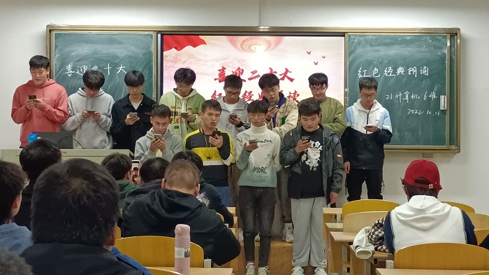 此次活动由组织委员李金烁同学主持,21计算机6班全体同学参与,“血泪注入长长的湘江 你们选择事不关己,跃过汹涌的湘江 跨过悲壮的土地,时间慢慢的褪去 古老城市的回忆,九百多里的湘江,承受多少苦难记忆,生命留下的意义,就是团结抗争到底。”第一组同学朗诵《湘江之歌》,各位诵读者的精彩演绎,让大家热血沸腾,沉浸在对党的无限热爱之中,第二组朗诵《祖国啊 母亲》,透过他们的声音,我们感受到了对祖国母亲深深的热爱之情,接下来第三组的《沁园春·雪》,向我们展示了大气磅礴、旷达豪迈的意境,表达了对祖国壮丽河山的热爱,歌颂了对英雄们的敬意。