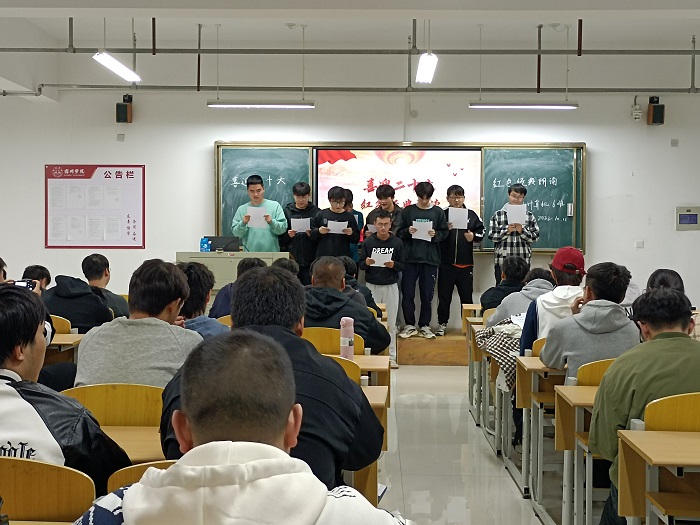 为迎接党的二十大胜利召开,热情讴歌党的百年奋斗历程和革命先辈的丰功伟绩,展现当代大学生朝气蓬勃、积极向上的良好精神风貌,2022年10月11日,环球360会员注册21计算机6班于实训楼A209举办了以“喜迎二十大,红色经典诵读”为主题的红色经典诗文朗诵大赛。